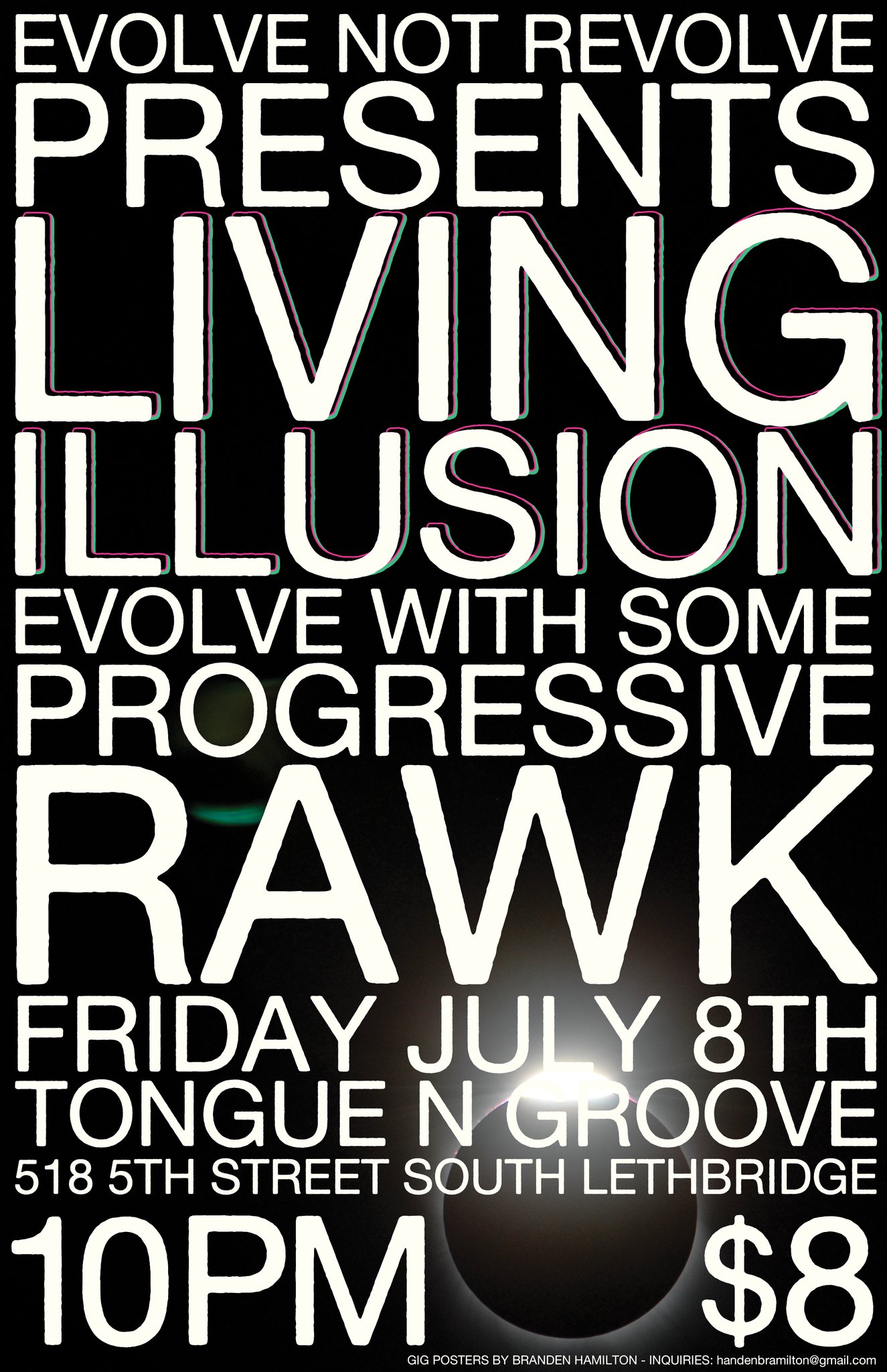 fter years of our music getting great spins and making it to the Top 10 of the Rock Charts at CKXU the University of Lethbridge Radio Station we’re finally coming to town to play a show in their beautiful city! Thanks to Evolve Not Revolve Productions and the stellar Tongue N’ Groove Venue Living Illusion will be coming down to Lethbridge this Friday July 8th 2011 to entertain and rock out. The band is definitely excited for this show and can’t wait to play for every one down there.